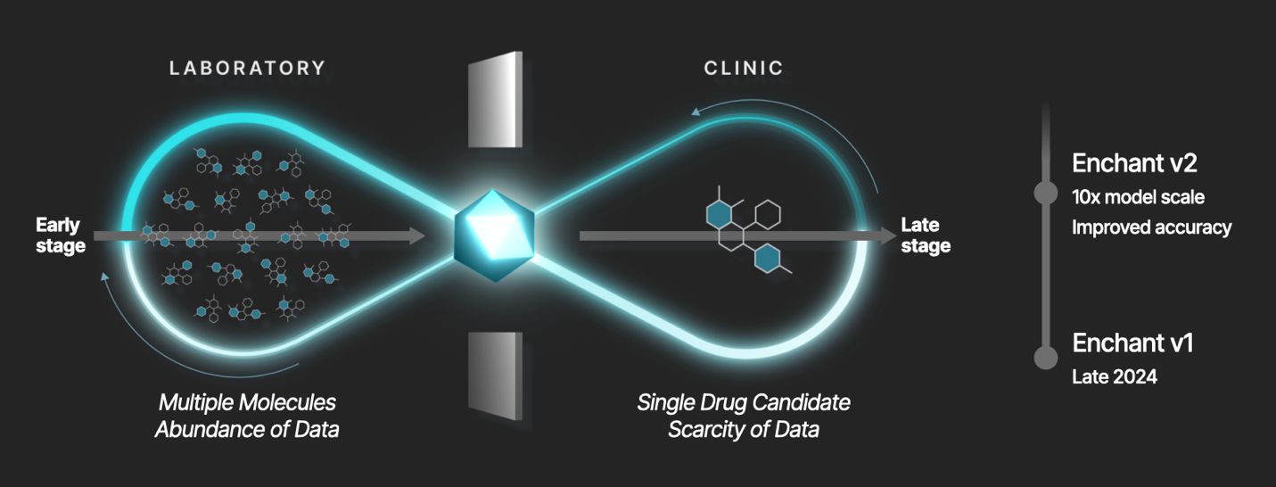 Enchant is a state-of-the-art multimodal transformer model that learns from small, noisy data sets to make informative predictions across a large array of biochemical and cellular activities, and for a wide range of target classes. Enchant breaks through the “data wall” between preclinical discovery and clinical development.